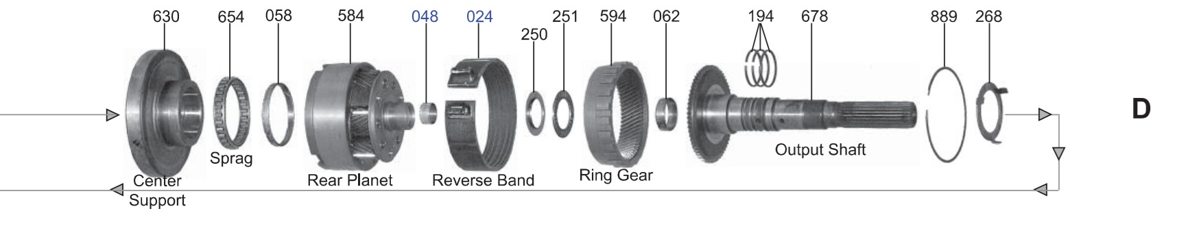 CENTER SUPPORT, SPRAG, REAR PLANET, REVERSE BAND, & OUTPUT SHAFT |